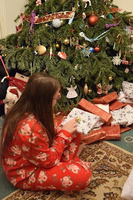Lily is almost always the first one awake in this house and never more so than on Christmas morning. We have a 'not before seven' policy which means they are given short shrift if they show up before seven in the morning. I heard little feet trotting down the corridor several times from half past six (and Lily says they were awake much earlier than that!) as Emma kept coming to check the time on Mark's alarm clock! On the dot of seven, two excited girls and a sleepy little boy who had been woken by aforementioned girls appeared in my room with their stockings. It is hard to be quiet when Father Christmas has filled your stocking whilst you were sleeping! We always have the stocking opening in our room before going downstairs to open the presents from us.